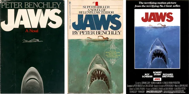 대부분의 사람들은 이 이미지를 상상할 수 있을 것입니다. 면도날처럼 날카로운 이빨을 드러내고 있는 백상아리가 헤엄을 치고 있는 여자에게 접근하는 장면입니다. 핏빛 블록 문자로 된 단순한 제목이 장면을 완성합니다. 여자, 상어, 물, 하늘, 제목 5가지 시각적 요소만으로 주제와 톤, 감성적으로 소통하는 구성이다. 좋은 영화 포스터(또는 책 표지)와 마찬가지로, 스토리가 무엇에 관한 것인지 정확하게 알려주는 동시에 더 보고 싶게(또는 읽고 싶게) 만듭니다.