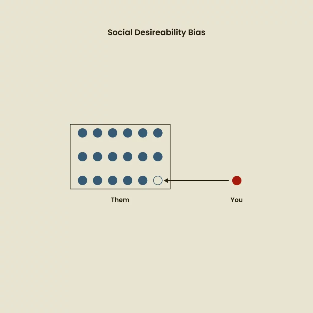사람들은 그들에 대한 거부와 혐오를 피하기 위해 집단의 일부가 되고자 하는 뿌리깊은 욕구를 가지고 있습니다. 연구 인터뷰 중에 인터뷰 대상자는 거짓말을 할 수 있고 면접관 앞에서 부끄럽거나 부끄러워 보이지 않도록 응답을 왜곡할 수 있습니다. 이에 대응하기 위해 연구자는 연구의 기밀성을 강화하고 참가자가 가능한 한 정직하게 행동하도록 장려해야 합니다. 이것은 또한 참가자들이 더 자연스럽게 행동할 수 있기 때문에 이러한 형태의 편견을 줄이는 데 관찰 연구가 인터뷰보다 더 유익할 수 있는 이유입니다.