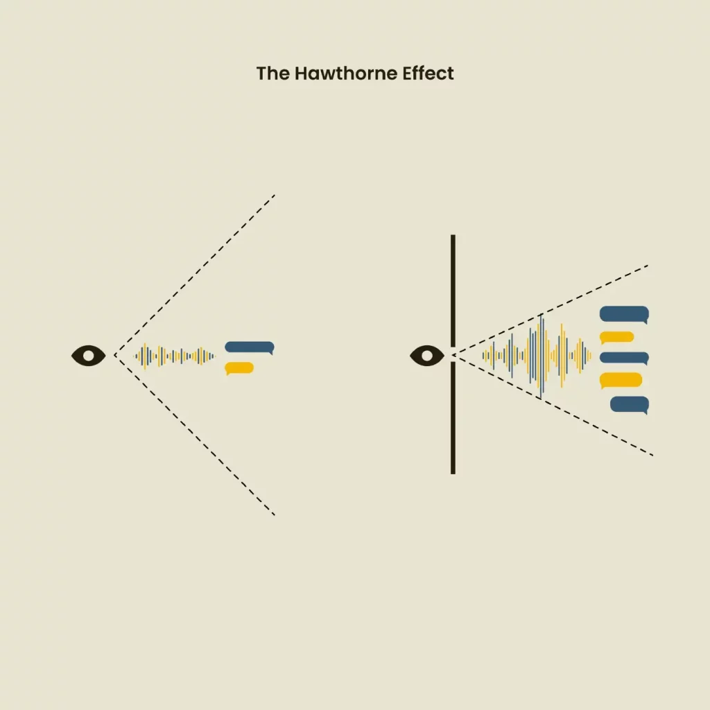 선생님이 보지 않을 때 다르게 행동했던 학교 시절을 기억하십니까? 아니면 부모님이 당신을 관찰하지 않을 때 다르게 행동했을 때? 이 '호손 효과'는 UX 리서치 연구 중에 발생할 수 있습니다. 즉, 당신이 연구하는 사람들이 거기에서 그들을 지켜보고 있기 때문에 그들의 행동을 바꾸는 것입니다. 참가자는 다르게 행동하고 판단으로 인식하는 것을 피하기 위해 말하는 것을 지켜볼 수 있습니다. 이에 대응하기 위해 연구원은 가능한 한 배경과 조화를 이루도록 노력하고 참가자가 주변에 아무도 없는 것처럼 행동하도록 장려해야 합니다.