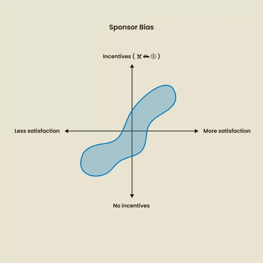스폰서 편향은 연구 결과가 조직의 목표에 편향된 연구 결과로 조직의 목표와 관심을 선호하는 경우입니다. X 조직이 다음을 제공하는지 확인하십시오. 본사로 가는 교통편을 제공합니다. 귀하의 시간을 지불하고 참여에 대한 금전적 보상을 제공합니다. 음식, 음료, 할인 및 따뜻함을 제공합니다. 참가자는 가능한 한 객관적이 되려고 노력할 수 있지만 그들에게 주어진 인센티브와 보상은 X 조직에 유리한 평가와 응답을 왜곡할 수 있습니다. Just Enough Research에서 Erika Hall이 언급한 것처럼 특정 회사의 이름을 지정하지 않고 조직의 목표에 대한 일반적인 설명을 사용하여 이에 대응할 수 있습니다.