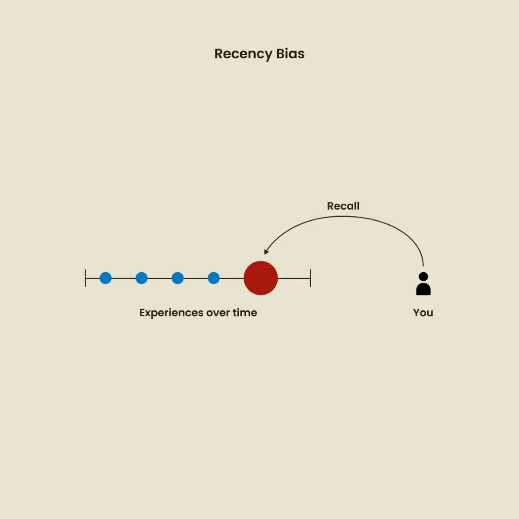 최신 편향은 보다 최근의 경험에 더 많은 가중치나 가치를 부여하는 인간의 경향을 나타냅니다. 예를 들어 학교를 보자. 최근 시험에서 나쁜 성적을 받았지만 이전에 완료한 7개의 시험에서 우수한 성적을 받았다고 가정해 봅시다. 대신 최근의 나쁜 시험 결과를 여전히 깊이 기억할 수 있습니다. UX 연구 내에서 연구자가 이전의 모든 데이터와 결과를 살펴보는 대신 가장 최근의 연구 결과를 기반으로 가정을 하는 경우 최신성 편향이 나타날 수 있습니다.