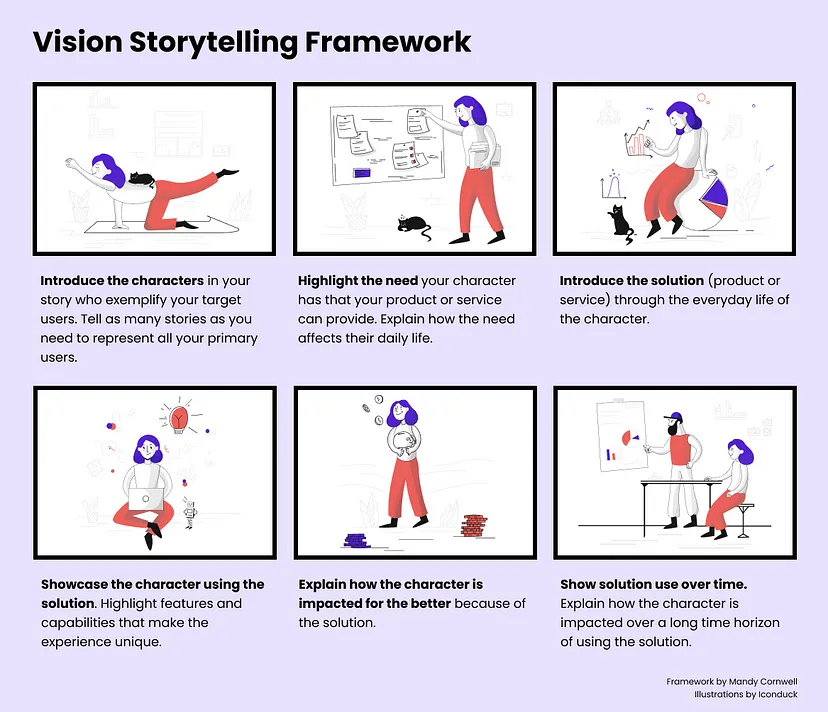 이야기는 비전을 위한 훌륭한 형식입니다. 잘만 하면 영감을 주고 관련성이 있으며 모든 그룹에서 공유하고 쉽게 이해할 수 있기 때문입니다. 시각적 스토리 또는 스토리는 캐릭터(사용자 페르소나/프로필 기반)와 일반적인 사용자 여정을 사용하여 솔루션(제품 또는 서비스)이 캐릭터의 삶에 어떻게 부합하고 솔루션이 사용자 경험과 비즈니스를 어떻게 변화시키는지 설명해야 합니다.