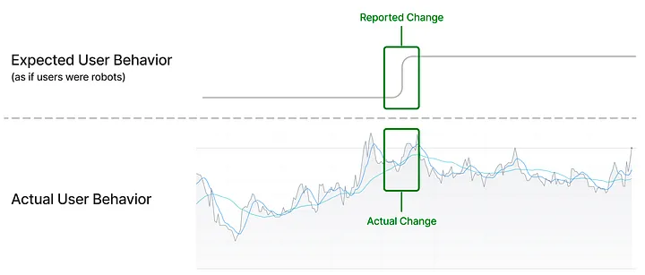 사용자의 행동은 설계 변경에 따라 복잡하고 비선형적인 방식으로 바뀔 수 있습니다. 변화에는 추세 방향의 변화, 추세 기울기의 변화, 새로운 패턴과 리듬의 생성, 새로운 자체 반복 패턴의 출현이 포함될 수 있습니다. 이러한 변경 사항을 측정하지 못하면 설계 변경의 영향을 제대로 이해하지 못할 수 있습니다.