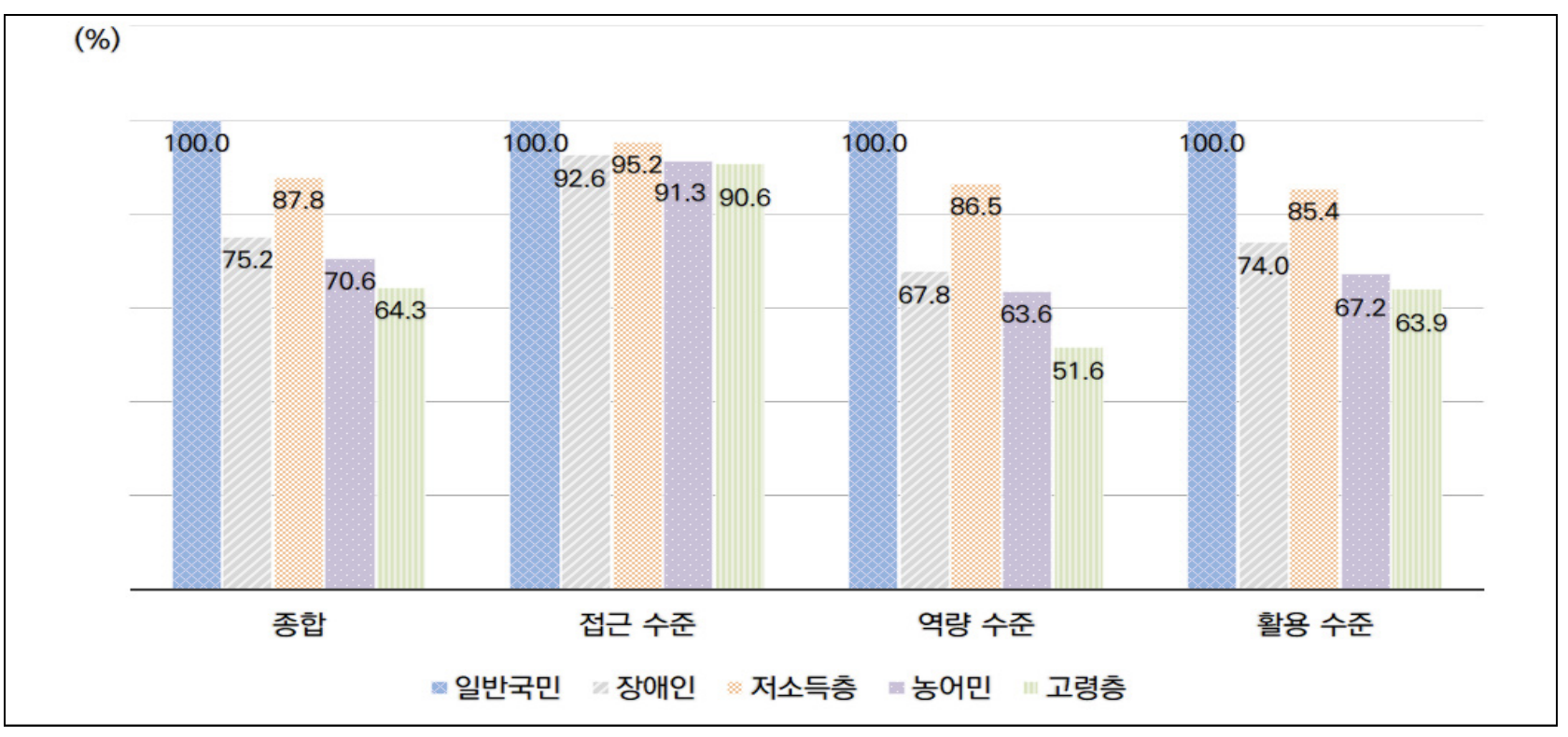 비중으로 따지면 고령층이 우리나라 인구의 주류를 차지하지만, 평균 디지털 정보화 수준으로 본다면 고령자는 정보기술 발달의 혜택을 받지 못하는 소외계층인 셈입니다. 식당 키오스크 앞을 서성이다가 자리를 뜨는 노부부, 온라인 뱅킹서비스를 이용하려다 그만 포기하는 어르신 등, 디지털 기기 사용이 익숙하지 않은 사람들의 경험과 혼란은 이미 우리에게 익숙한 이야기죠. 이들의 디지털 접근성 개선에 공감하는 목소리는 점차 확대되고 있으나, 세대 간 정보격차 현황은 여전히 비슷한 수준에 머물러 있습니다.