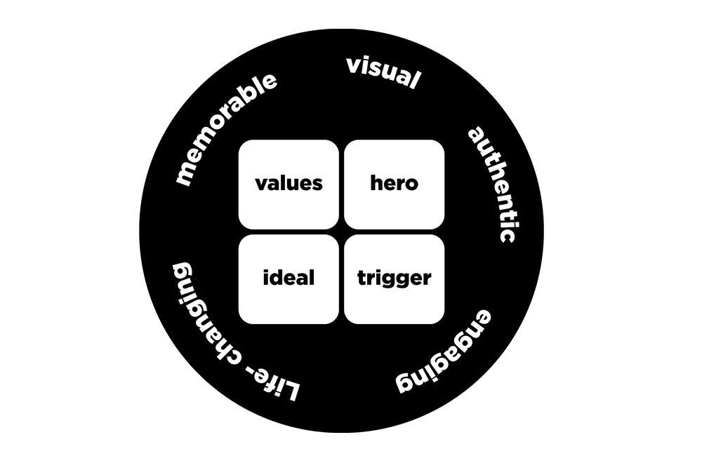 바깥쪽 원은 말하자면 브랜드 스토리를 포장하는 것입니다. 감정을 더하고 스토리를 더욱 실감 나게 만드는 다섯 가지 기능은 다음과 같습니다. 귀하의 브랜드 스토리에 이러한 특성이 모두 포함되어 있다면 귀하의 스토리는 지속될 것이라고 확신할 수 있습니다. 다음을 모두 포함하는 것을 목표로 해야 합니다.