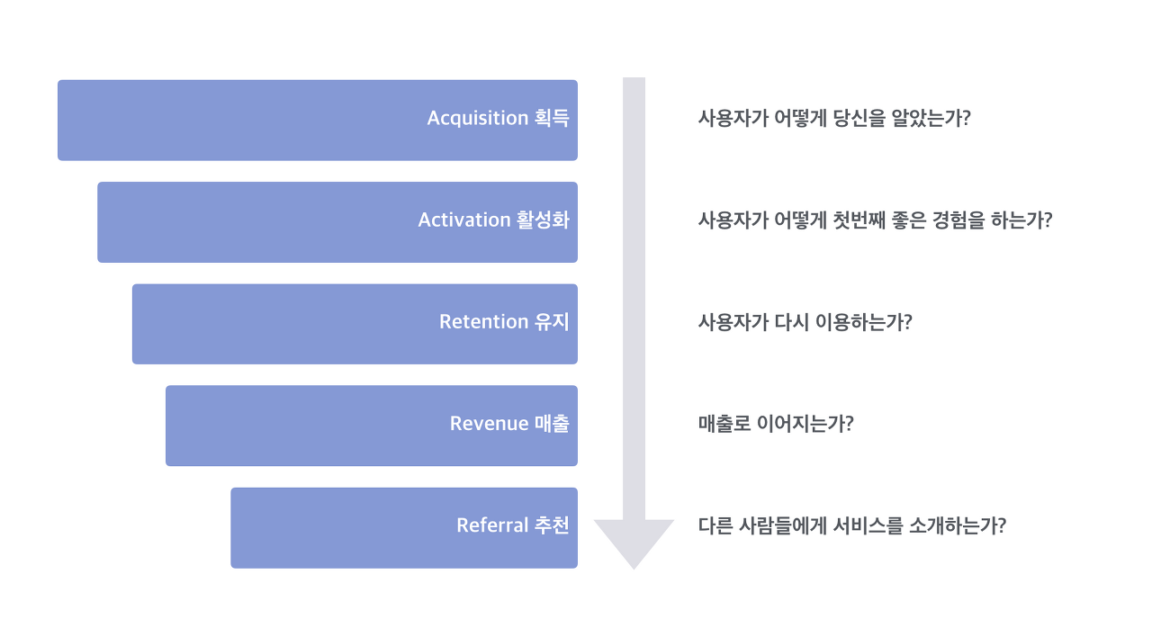 AARRR은 미국의 스타트업 엑셀러레이터인 500 Startups를 이끌고 있는 데이브 맥클루어가 고안한 것으로 유저의 행동을 획득(Acquisition), 활성화(Activation), 유지(Retention), 수익화(Revenue), 추천(Referral)의 5가지 단계로 나눠 그 첫 글자를 조합한 것입니다. 이 다섯 가지 각 단계를 도식화하면 퍼널(깔때기) 형태가 됩니다. 이 프레임워크에 맞춰 서비스 현황을 데이터로 가시화하고 진단하며 디벨롭시켜 나가는 것을 추천합니다.