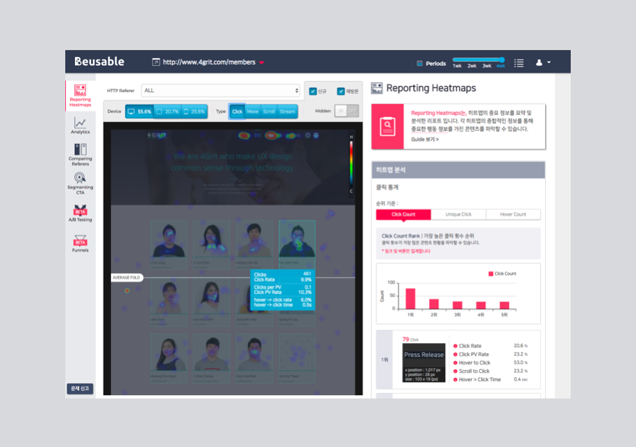 포그리트는 얼마 전 www.4grit.com 공식 사이트를 리뉴얼하였습니다. 이 리뉴얼도 그로스 해킹의 결과라고 볼 수 있는데요, 서비스로 이동하는 배너의 CTR(Click Through Rate, 노출수 대비 클릭수)은 높았지만 CVR(Click conVersion Rate, 클릭수 대비 전환수)는 낮았습니다. 이 점을 파악한 후 랜딩페이지 전반적인 색감과 비주얼을 CTR과 관련 아이콘 색상에 맞게 변경하였습니다. 이를 통해 CVR이 10% 개선되었습니다. 또한 서비스 중에서 뷰저블 클릭률이 다른 서비스에 비해 저조한 것을 확인한 후 레이아웃과 위치를 개선하였습니다. 이를 통해 뷰저블 서비스로의 이동하는 사용자(클릭률)가 약 3배 이상 증가하였습니다. 이뿐만이 아니라 계속해서 조금씩 개선을 실행해 나가고 있습니다.