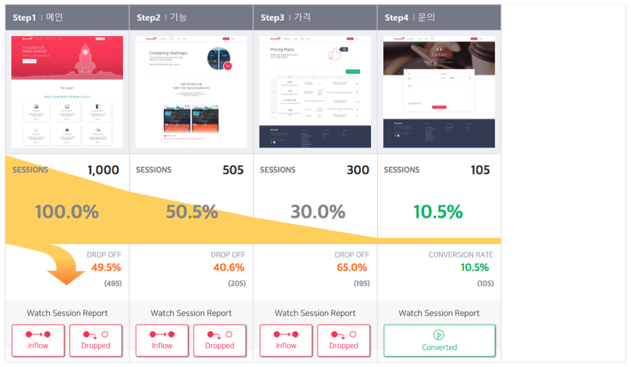 예시 : 뷰저블에서는 AARRR을 위한 핵심 페이지를 퍼널로 설정할 수 있습니다.