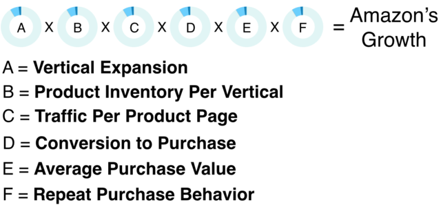 - B=Product Inventory Per Vertical (수직적 상품재고): 어떻게 아마존이 10권의 책을 지구상의 모든 책으로 확대하여 1,000 만권씩 팔게 할 수 있었을까요. 아마존의 성장은 제품 별 재고의 깊이와 비례하였습니다. 재고를 확보하는 것, 이 재고가 성장의 척도가 되어야 하는 점이 중요합니다.