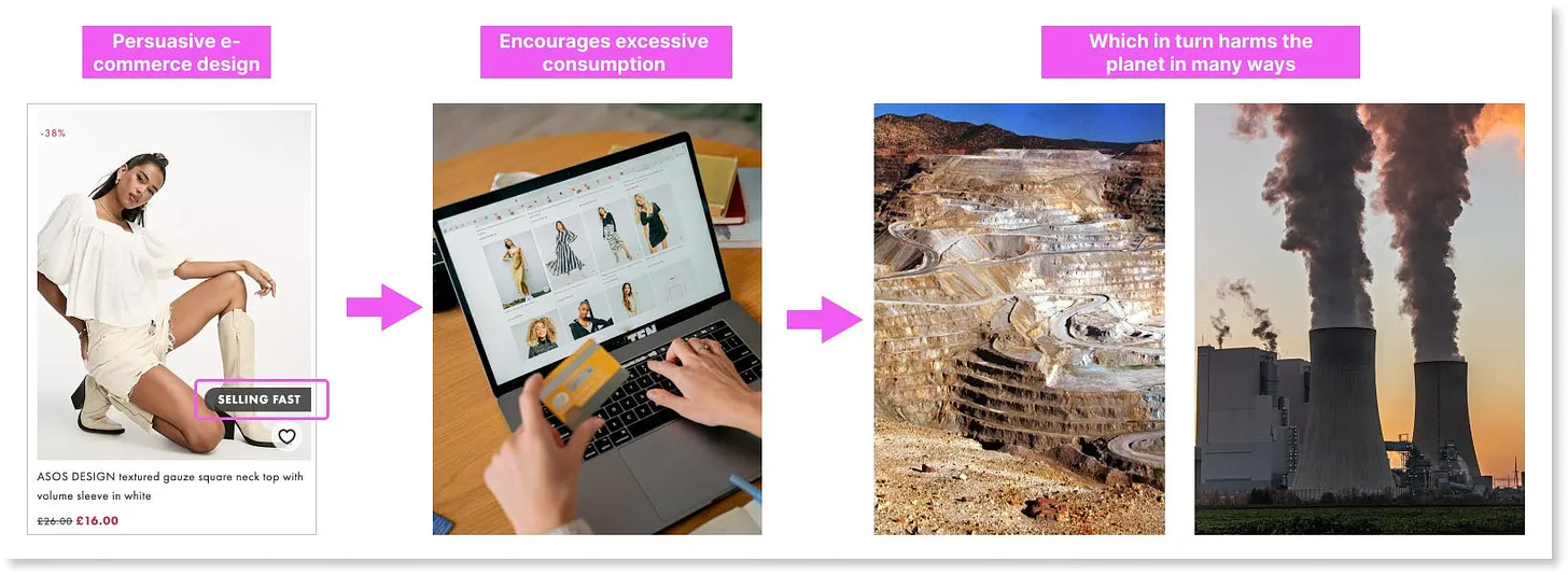 전자상거래는 생활과 경제의 중요한 부분이며 살기 좋은 미래를 위해서는 미래를 설계하는 방식을 바꿔야 합니다. 책임 있는 디자이너로서 우리는 과잉 소비 문제가 있다는 것을 인식해야 합니다. 우리의 작업은 지속 불가능한 사용자 행동을 가능하게 하고 가속화하는 것입니다. 환경 위기 상황에서는 지속 불가능한 행동을 설계할 수 없습니다. 사용자 중심의 렌즈를 통해 디자인 결정만 보는 한, 디자인의 더 넓고 간접적인 영향을 간과하기 쉽습니다.