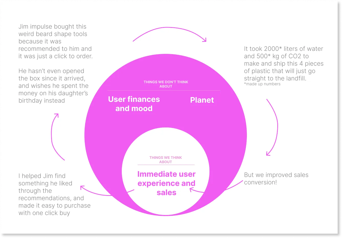 전자상거래는 생활과 경제의 중요한 부분이며 살기 좋은 미래를 위해서는 미래를 설계하는 방식을 바꿔야 합니다. 책임 있는 디자이너로서 우리는 과잉 소비 문제가 있다는 것을 인식해야 합니다. 우리의 작업은 지속 불가능한 사용자 행동을 가능하게 하고 가속화하는 것입니다. 환경 위기 상황에서는 지속 불가능한 행동을 설계할 수 없습니다. 사용자 중심의 렌즈를 통해 디자인 결정만 보는 한, 디자인의 더 넓고 간접적인 영향을 간과하기 쉽습니다.