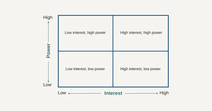 - 낮은 관심, 높은 권력 : 이 사분면은 프로젝트에 대한 관심이 높지는 않지만 결과에 큰 영향을 미칠 수 있는 이해관계자를 나타냅니다. 이러한 이해관계자들은 프로젝트에 영향을 미칠 수 있는 잠재력을 갖고 있으므로 참여해야 하며 그들의 필요와 우려 사항을 고려해야 합니다.