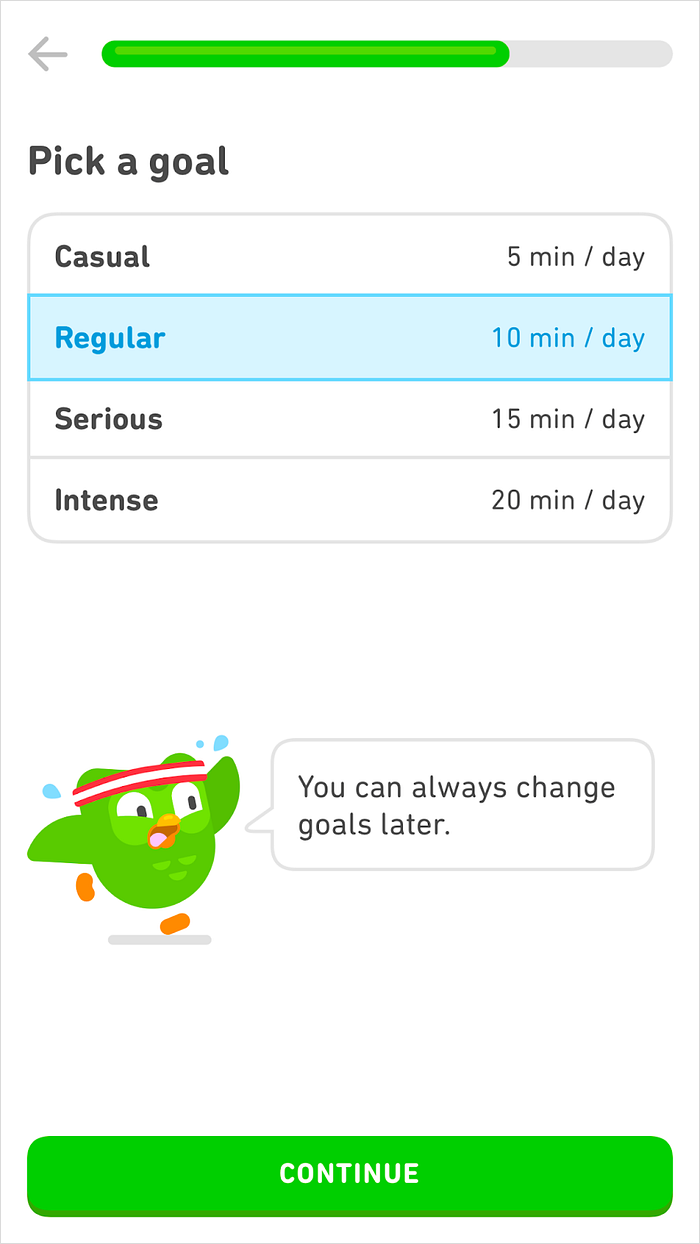 듀오링고가 온보딩 중에 이 정보를 수집하고 나중에 시스템이 사용자의 동기가 낮다는 것을 감지하면(예: 비활동 기간) 사용자 여정에서 Ovsiankina 효과를 활용하여 보다 대상이 지정된 메시지로 푸시 알림을 개선할 수 있습니다. "오늘 5개의 새로운 스페인어 단어를 배우세요"라는 일반적인 알림 대신 사용자에게 스페인어 학습의 초기 목표를 상기시킬 수 있습니다.
