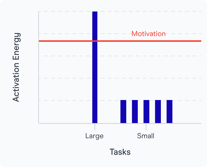 이것은 큰 작업을 완료하는 데 필요한 '활성화 에너지'가 일반적으로 일련의 작은 작업을 완료하는 데 필요한 활성화 에너지보다 높다는 사실에 의해 뒷받침됩니다. 더 크고 더 어려운 작업은 압도적일 수 있고 사람들이 의욕이 없거나 시작조차 주저하게 만들 수 있기 때문입니다. 반대로 소규모 작업은 종종 덜 위협적이며 사용자가 수행하기 더 관리하기 쉽습니다.