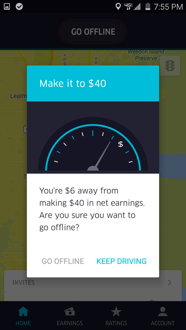 물론 이러한 기술은 다른 방식으로도 활용될 수 있습니다. Uber의 '소득 타겟팅'을 예로 들어 숨겨진 '임의의 엔드포인트 트랩' 메커니즘이 작동하는 방식을 살펴보겠습니다. Uber의 소득 타겟팅은 운전자 가 매일 근무를 시작할 때 스스로 재정 목표를 설정할 수 있는 기능입니다. 즉, 이 패턴은 운전자가 임의적이지만 야심 차고 달성 가능한 목표를 설정하도록 권장합니다. 하루에 완료하는 여행 횟수를 자발적으로 '반올림'하여 공급업체 유동성(드라이버)을 증가시키는 훌륭한(그러나 의문의 여지가 있는 비윤리적인) 방법입니다.