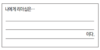 이 칼럼을 읽고 있는 독자들은 잠시 DBR을 옆에 내려 놓고 1∼2분 정도 눈을 감고 명상을 해보기 권한다. 그리고 나에게 리더십은 어떤 의미일까에 대해 생각해 보기 바란다. 본인의 경험을 바탕으로 가슴에서 우러나오는 ‘나에게 리더십은 이런 것이다’를 아래 칸에 써보기 바란다. 여기서 중요한 것은 어디서 보았던 멋진 리더십의 정의를 옮겨 적는 게 아니라 내 가슴에서 우러나오는 나만의 리더십에 대한 정의를 쓰는 것이다.