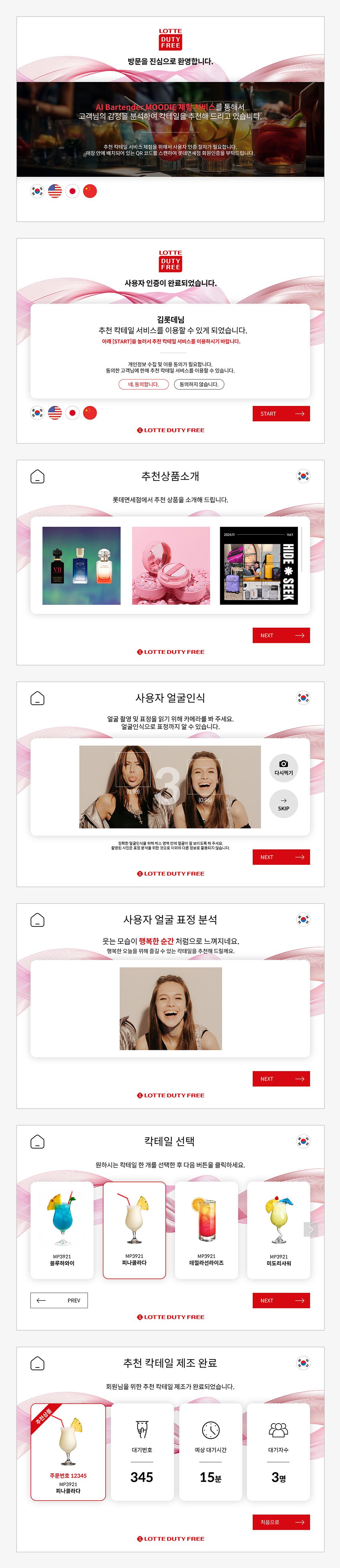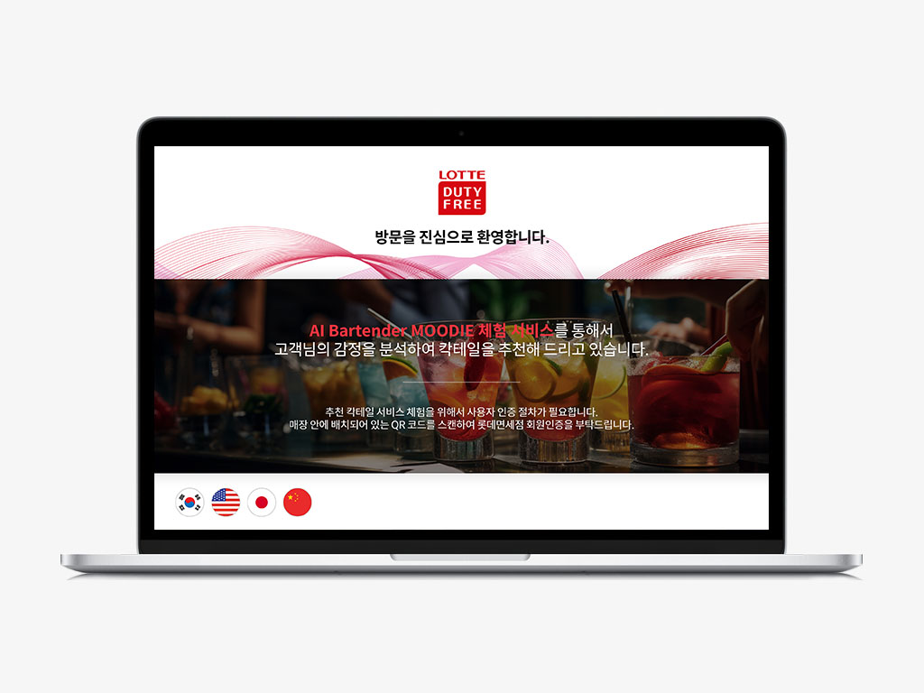 태블릿 화면에서 시음권을 입력하고 여권 스캔으로 본인 인증을 거치면 로봇 바텐더가 고객의 7가지 얼굴 표정을 판별하여 표정과 기분을 인식한 후 추천하는 주류를 만들고 제공하는 역할을 한다. 고객이 태블릿 화면을 따라가기 쉽게 접근 용이성을 고려하여 UI/UX를 구현했다.