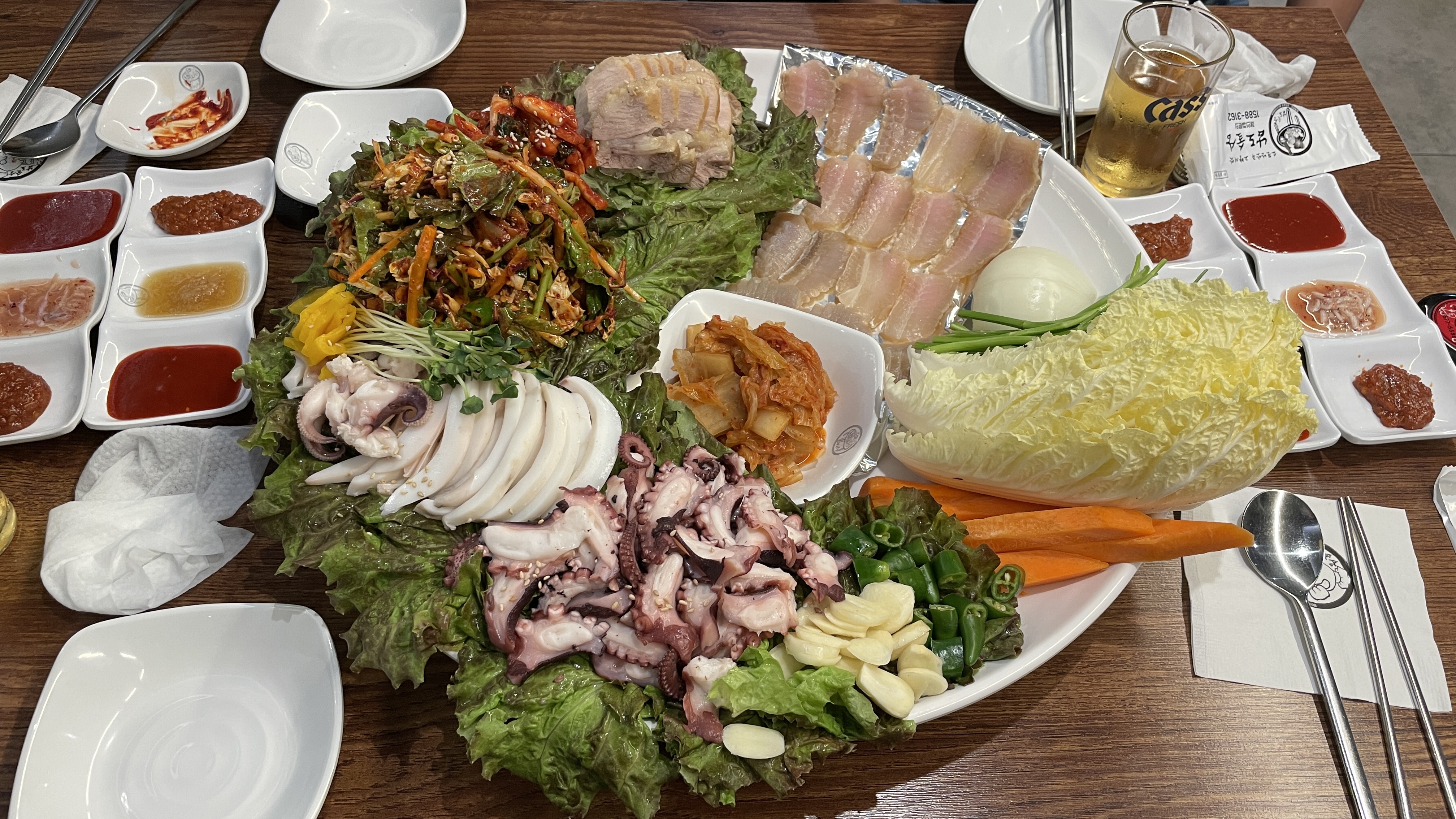 암튼 맥주와 소주도 주문하고 주문한 음식이 나오기까지 기다리는 시간에 가벼운 담소를 나누고, 못 본 사이에 있었던 에피소드부터, 지금 하고 있는 프로젝트에 관한 것까지 풀어놓으며 시간 가는 줄 몰랐습니다. 그러는 사이 주문한 음식이 나왔고, 대형 접시 한쪽에 놓인 홍어가 눈에 가장 먼저 들어왔습니다. 홍어는 정말 오랜만에 먹어 봅니다. 예전에 대학 동창들과 을지로에 있는 할머니집이라는 대폿집에서 삼합을 먹어 본 이후로 꽤 오래된 기억 속에 있었던 홍어를 오랜만에 보게 되는 순간입니다. 워낙에 호불호가 갈리는 음식으로 요즘 젊은 친구들은 잘 찾지 않는 음식이기도 하지요.