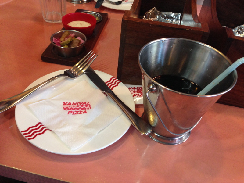 잠시 기다리는 사이에 접시와 샐러드, 음료가 나와서 피자가 나오기 전에 한 컷 찍어 봤습니다.