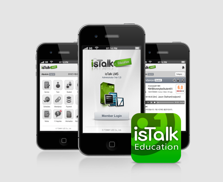 모바일 환경에 최적화하고, 대응하기 위한 isTalk 관리자 전용 홈페이지와 사용자(수강생) 관리용 홈페이지 두가지 중에 관리자 전용 모바일 웹사이트입니다. 모바일 웹을 사용하기 위해서는 먼저 isTalk.kr 홈페이지에서 업체등록을 해야 합니다. 기본적인 기능은 수강생관리, 출석관리, 학습관리, 교재관리, 수강예약관리, 강사관리를 할 수 있습니다.