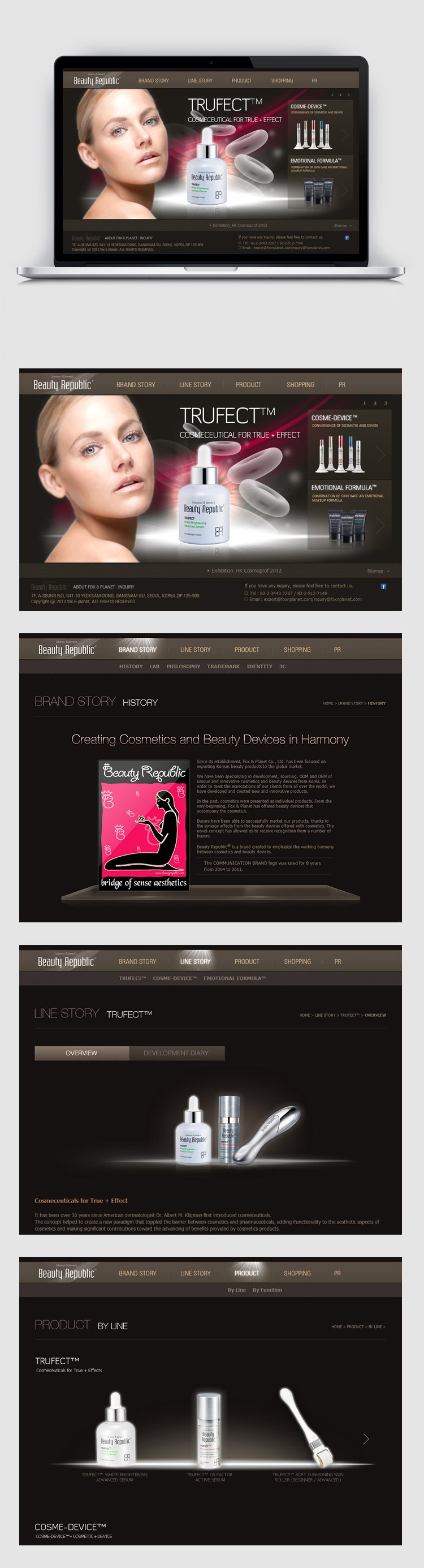 화장품 브랜드 홈페이지 제작. 직관적인 인터페이스 구조와 고급스러움을 강조할 수 있는 브라운 계통의 칼라를 활용하여 화장품 브랜드 아이덴티티를 구현하였다.