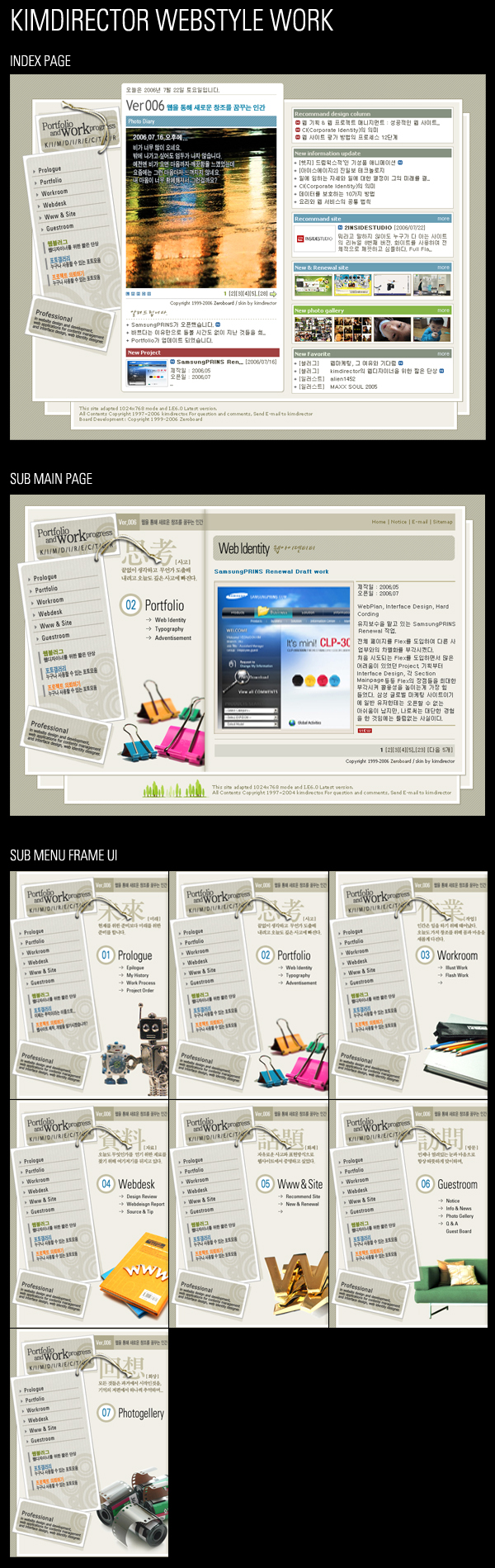 2004년 부터 현재까지 운영되어 왔던 홈페이지 디자인과 UI 화면들. 책갈피를 메인메뉴에 활용하였고, 끈 이미지를 찾지 못해 직접 작업했다. 칼라배열은 조금은 따뜻한 계열의 칼라들을 사용.