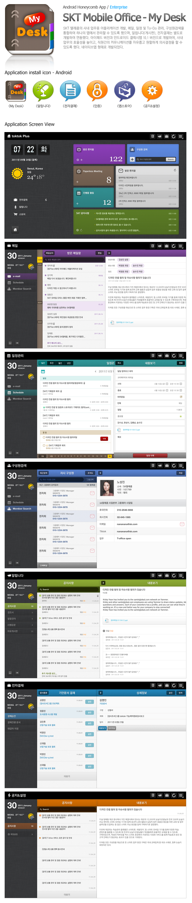 My Desk는 통합형으로 메일관리와 일정관리 및 To-Do관리, 구성원검색으로 구성되었으며, 인덱스 화면을 통해서 세가지의 구성요소들을 적절하게 배치하여, 쉽고 빠르게 정보에 접근할 수 있도록 했다. 알립니다(게시판), 전자결재는 별도의 앱으로 구성하여 My Desk와 연동하였고, 알립니다(게시판)은 사내 자유게시판으로 사내의 직원들간의 의사소통 및 커뮤니케이션을 으한 공간이며, 전자결재는 온라인 문서 결재 시스템이다. 인증과 앱스토어는 어플 설치에 필요한 필수 어플이다. 전체적으로 직관적인 인터페이스 환경과 앱과 앱의 상호 연동을 통해 쉽게 진입할 수 있도록 개발하였다.