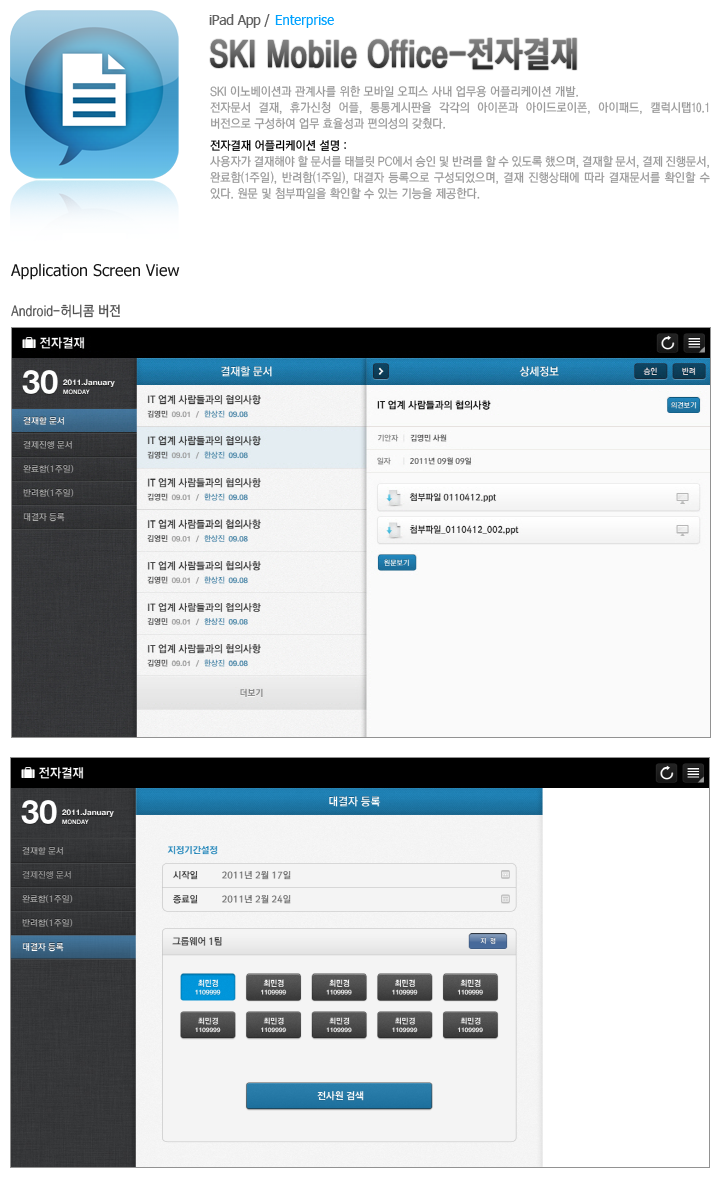 SK 이노베이션과 관계사의 사내 모바일 오피스 어플리케이션 개발. 사용자 편의성과 업무 효율성을 고려한 인터페이스 구조와 적절한 디자인 구성을 반영. 네이티브 앱과 하이브리드 앱으로 구성.