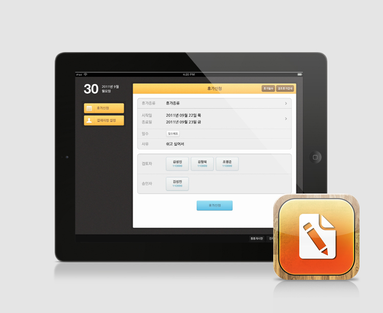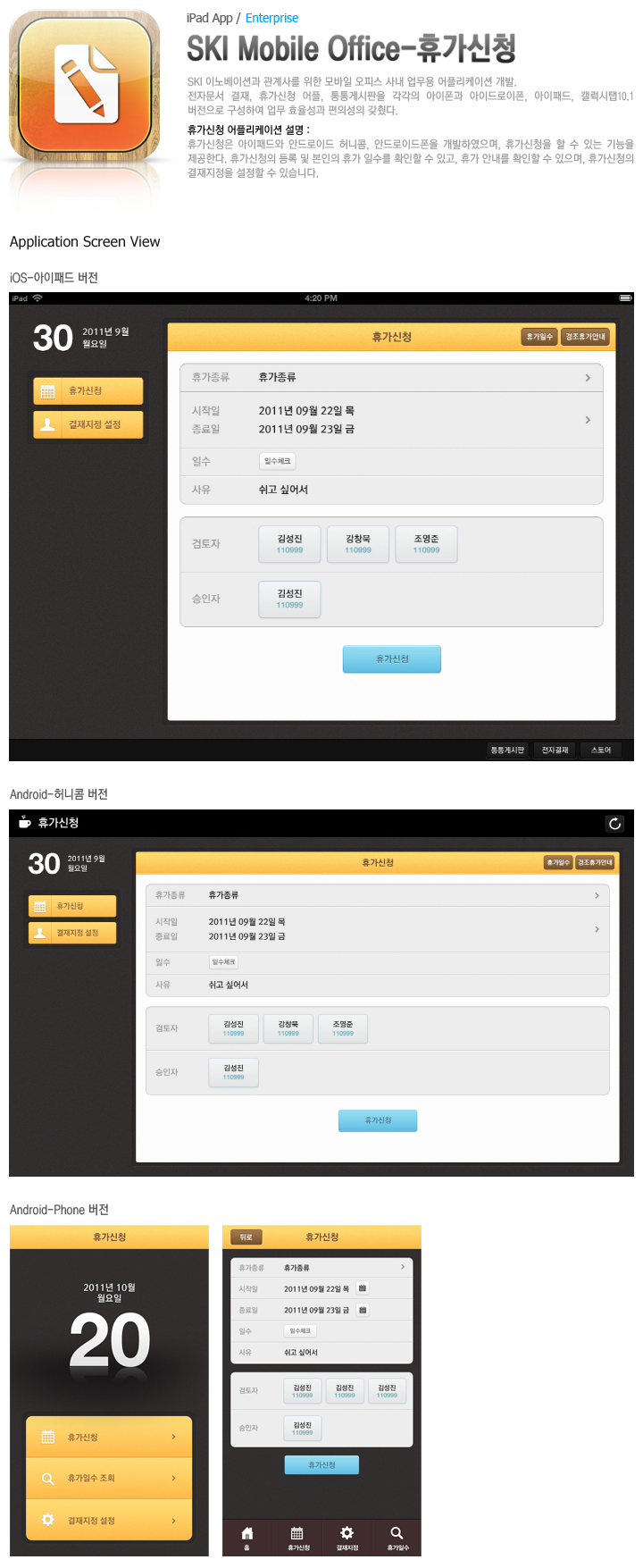 SK 이노베이션과 관계사의 사내 모바일 오피스 어플리케이션 개발. 사용자 편의성과 업무 효율성을 고려한 인터페이스 구조와 적절한 디자인 구성을 반영. 네이티브 앱과 하이브리드 앱으로 구성.