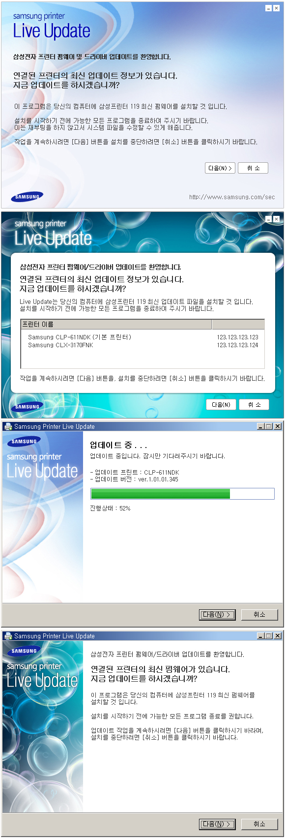 전체적으로 삼성전자 프린터 라이브 업데이트 어플리케이션 디자인 스타일 화면.
