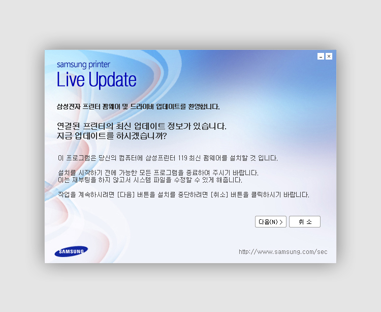 전체적으로 삼성전자 프린터 라이브 업데이트 어플리케이션 디자인 스타일 화면.