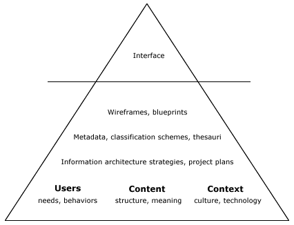 인과관계를 이루고 있는 선행 요소들은 다른데 최종 결과물인 사용자 인터페이스와 디자인이 같다면, 이를 어떻게 이해해야 할까? 그래서 비전략적인 모방을 무지와 무능력의 소치로 본 것이다. 더군다나 아래 그림처럼 정보화 부분만 따로 떼어놓고 보더라도, 눈에 보이는 부분은 진정 전체의 일부에 지나지 않다. 즉, 사용자의 원하는 바(user needs)와 이를 달성하기 위한 행태(user behaviors), 이에 대응하기 위한 콘텐츠 구조(content structure)와 의미요소(meaning), 그리고 사용자와 콘텐츠를 둘러싼 콘텍스트(context)를 논리적으로 정보화(기획 및 설계) 한 결과가 바로 사용자 인터페이스이다.