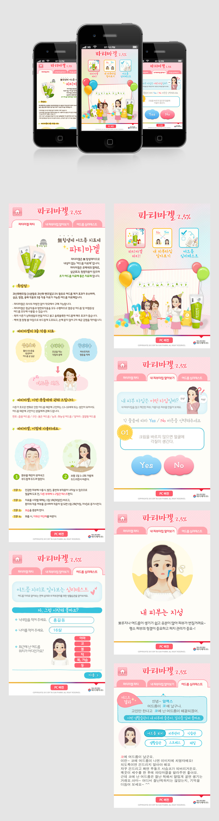 여드름에 대한 정보와 파티마겔 여드름 치료제에 대한 정보를 다루고 있다. 내 피부타입, 여드름 심리테스트를 통해 내 피부 타입과 재미로 알아보는 심리 테스트도 즐길 수 있도록 구성했다.