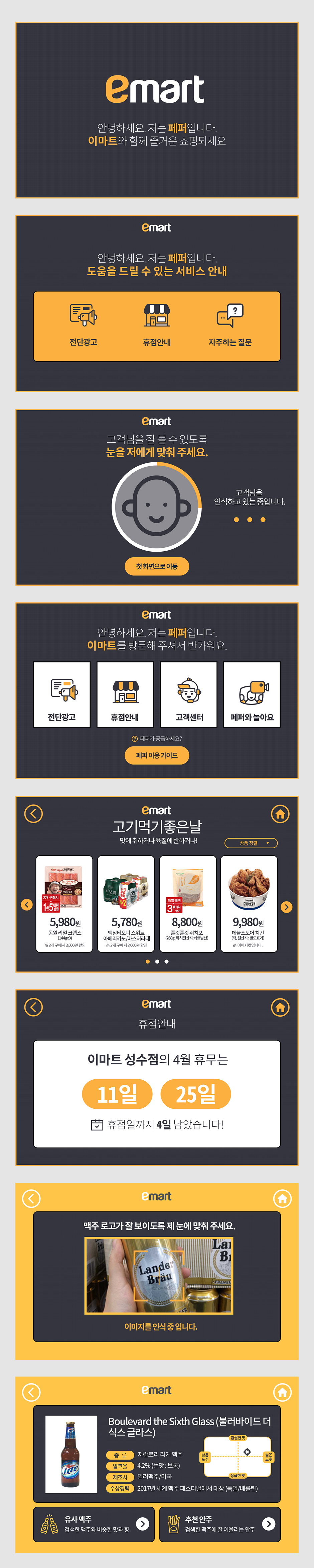 이마트 휴점안내, 수입상품 소개, 수입 맥주 상품 등의 정보를 소개하고 페퍼와 함께 사진찍기, 놀이를 통해서 고객에게 흥미유발 및 재미를 줄 수 있도록 했다.