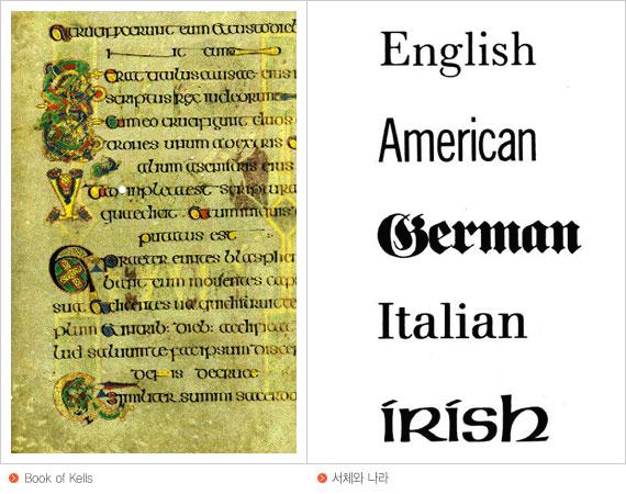 페니키아의 문자로부터 그리스와 로마를 통해 발전해온 서구의 알파벳의 경우, 2000년 전에 돌에 새겨졌던 글자와 그 이후 펜으로 쓰는 형태로부터 각 나라들이 자신들의 글자꼴을 발전시키면서 특정한 나라와 그 나라의 이미지를 연상케 하는 글자 사이의 관계가 맺어지기도 했다. 예를 들어, 조금만 글씨체에 관심을 가지고 있는 사람이라면 알 수 있는 것으로 아이리쉬(Irish) 서체가 있다. 이것은 아일랜드에서 9세기 초에 필사본으로 완성된 라틴어 복음서 "켈스의 서(book od Kells)"에 있던 독특한 형태의 글자에서 비롯된 것인데, 이후 수없이 많이 사용되면서 그 모양이 곧 아이리시 민족을 상징할 만큼 이미지가 굳어진 경우이다. 특별한 내력이 있던, 혹은 없던 글자를 반복해서 사용함으로서 그러한 고정관념이 강화되는 것이다.