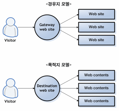 웹사이트는 콘텐츠 비즈니스 성격에 따라 경유지로써의 웹사이트(이하 ‘경유지’)와 목적지로써의 웹사이트(이하 ‘목적지’)로 구분할 수 있다. 경유지는 효과적인 콘텐츠 소비가 이루어질 수 있도록 방문자에게 적절한 웹사이트를 연결시켜 주지만, 목적지는 콘텐츠가 효과적으로 소비될 수 있도록 방문자에게 적절한 콘텐츠를 연결시켜 준다. 따라서 경유지는 목록(index) 중심의 비즈니스, 목적지는 내용(contents) 중심의 비즈니스를 영위하고 있다고 볼 수 있다.