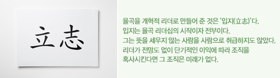 율곡을 개혁적 리더로 만들어 준 것은 두 음절로 된 ‘입지(立志)'라는 단어다. 뜻을 세운다는 의미인 이 단어는 우리에게도 낯설지 않다. 그러나 이 말이 한 사람의 운명을 결정짓는 키워드이자 모든 행위의 뿌리로 얼마나 크게 기능하는가에 대해서는 깊이 생각해 보지 못했을 것이다. 입지는 율곡 리더십의 시작이자 전부이다. 그는 뜻을 세우지 않는 사람을 사람으로 취급하지도 않았다. 오늘날로 따지면 공약 없이 유세하는 정치인과 같은 것이다.