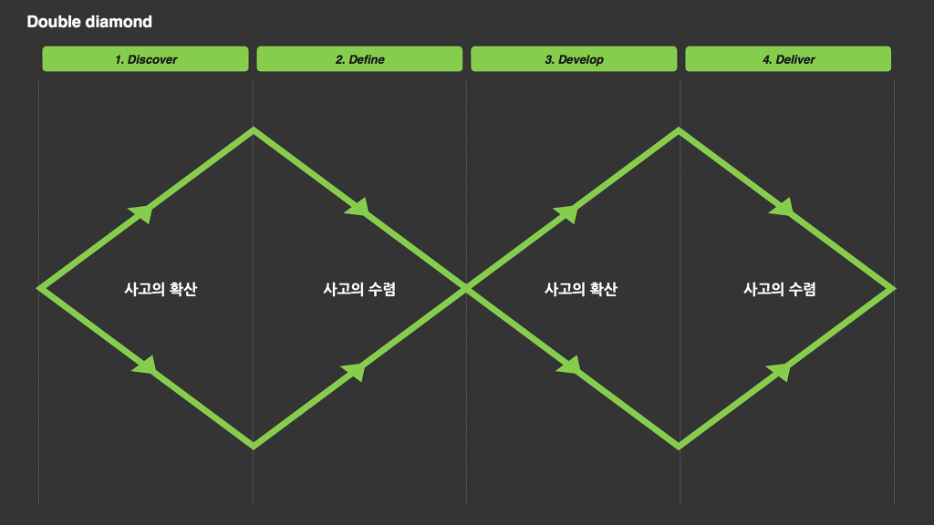 대다수의 프로젝트는 사고의 확장과 수렴과정을 거치게 되는데요. 더블 다이아몬드를 예로 들어 설명하자면, 대게 사고의 확장 단계보다 수렴 과정이 업무량이 많아지는 단계입니다. 산출물을 만들어 내는 시기이기 때문이죠. 그래서 수렴 과정에 새로운 인력에 대한 필요성을 많이 느끼게 됩니다.