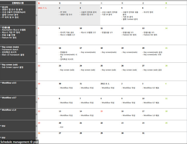 프로젝트 시작과 함께 논의하는 것은 일정에 관한 것입니다. 일정은 시간이고, 시간은 곧 비용을 의미하기 때문에, 일정에 대한 감을 가진다는 것은 PM에게 무엇보다 중요합니다. ‘이 정도 시간이면 이 정도의 일을 할 수 있을 것이다’라는 계산이 이루어져야 하는 것이죠. 그 계산을 하는 데는 함께 일하는 팀원들의 업무 능력도 파악해야 하고 월간, 주간, 일간 별로 해야 할 일과 진행 과정을 머릿속에서 그려보고, 압축하고, 분절시킬 수 있어야 합니다.