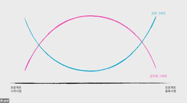 프로젝트 초기에는 새로운 업무에 대한 호기심과 열정으로 긍정적인 감정이 생기지만, 프로젝트가 진행됨에 따라 업무량과 강도는 점점 높아지고, 호기심과 열정이라는 긍정적인 감정은 줄어들어 부정적인 감정이 늘어갑니다. 프로젝트 중반이 넘어가면서 다시 업무량이 줄어들고, 자신들이 창조해 낸 산출물에 대해 보람과 성취감을 느끼며 다시 긍정적인 감정이 발생하게 되는 것이죠.