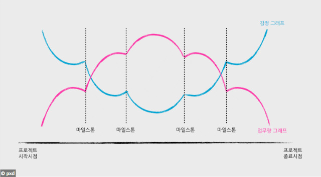 일반적으로 프로젝트를 시작하면 ‘업무 감정’과 ‘업무 강도’는 아래와 같은 모습을 띄게 됩니다.
