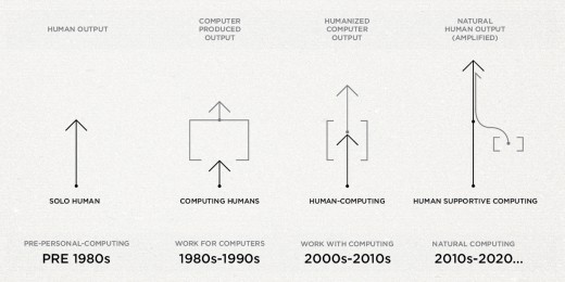 개인 컴퓨터의 보급이 시작된 1980년대부터, 다양한 요소들이 컴퓨터 사용 환경에 추가됨에 따라 개인 컴퓨터 사용 경험을 도입하려 하던 사람들의 계획은 “인간”에게 만 제한되게 되었습니다. 80년대 초부터 지금까지, 컴퓨터 앞에 앉아서 컴퓨터를 사용한다는 패러다임을 유지해 온 것이 정말 놀라운데요. 거기에 모니터, 키보드, 마우스의 셋업까지, 작은 상호작용의 변화가 있었지만, 그 외의 요소들은 예전부터 지금까지 바뀌지 않았습니다.