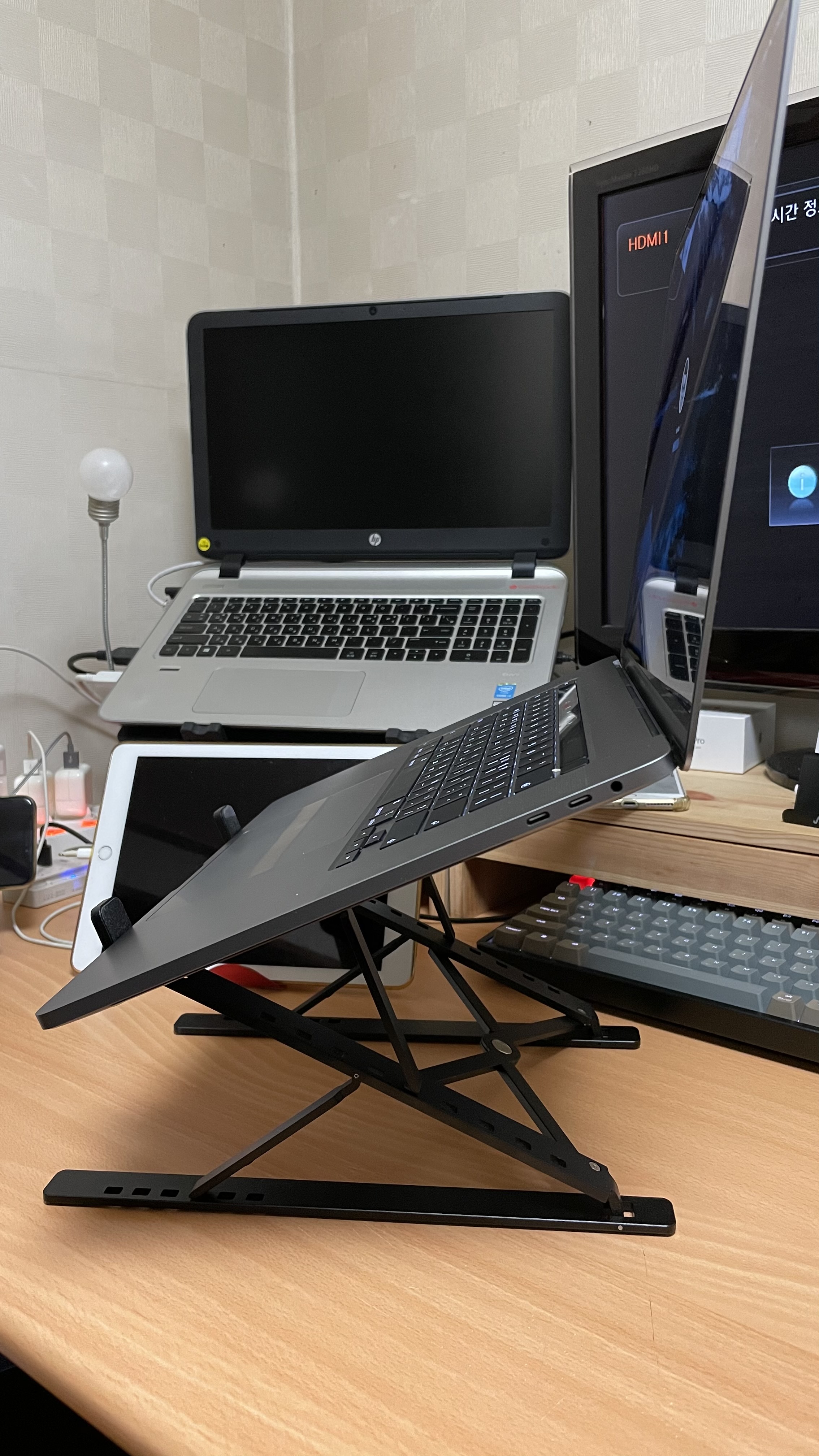 대체적으로 만족감을 가졌던 거치대가 이런 작은 것에서부터 거치대에 기대는 믿음과 신뢰를 한순간에 저버리는 것이야말로 천인공노하지 않을 수 없다 하지 않겠나. 하여 처음으로 노트북 뚜껑을 닫고 퇴근을 할까 하다가 이런 작은 것들 때문에 그동안 나름 지켜온 루틴이 깨지는 게 자존심이 다칠까 그만두고 습관처럼 뚜껑을 닫고, 아침에 출근할 때, 조심해서 열어야지 하는 같잖은 스트레스를 받으며 아침을 맞이하고 있다. 그렇게 일주일이 지난 지금은 어느 정도 익숙함이 생기게 되었다. 조금만 신경 써서 만들었으면 하는 아쉬움이 있다. 충분히 테스트를 했는지, 의심스럽지만, 암튼 나에겐 아찔한 순간이 아닐 수 없다.