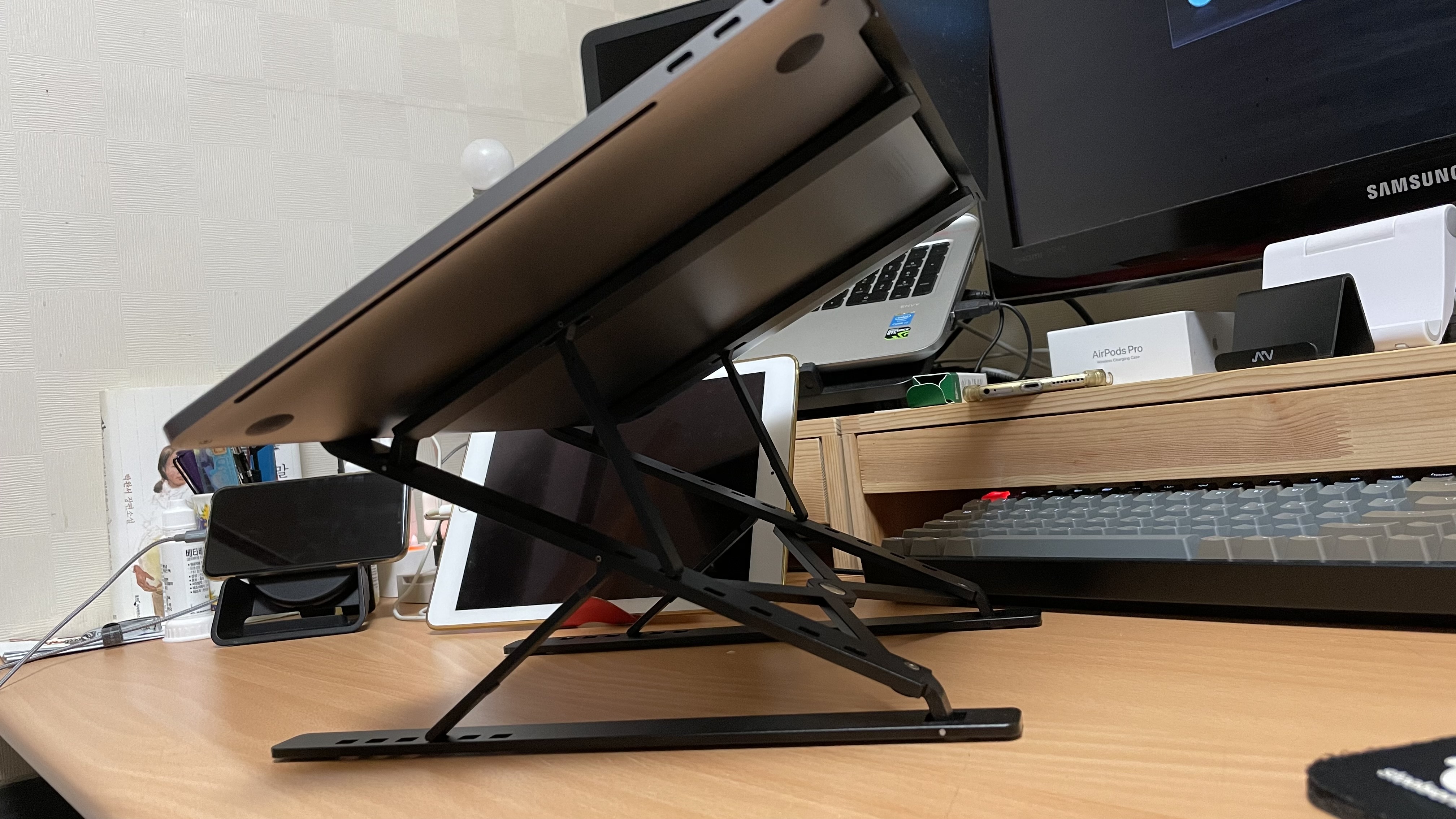 아래 이미지는 집에서 간단하게 언박싱했을 때의 사진과 문제가 없는지 확인하기 위한 맥북프로 16인치를 거치했을 때의 모습이다. 참고했으면 좋겠다. 책상 주변에 다양한 기기들로 인해 어수선한 모습이 좀 부끄럽다. 책상도 언젠가는 싹 정리해서 새로운 환경을 만들기 위해 고민이 큰 부분이다. 언젠가는 하겠지만 현재는 귀차니즘에 빠져 있어서 아무것도 하기 싫다. ^^;
