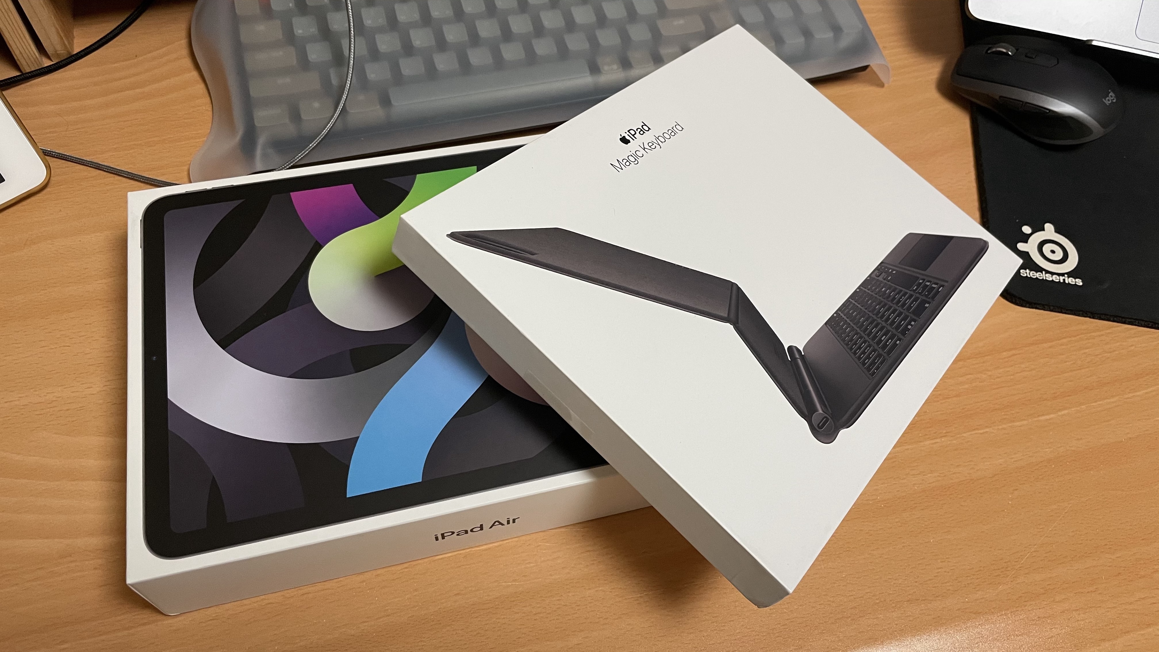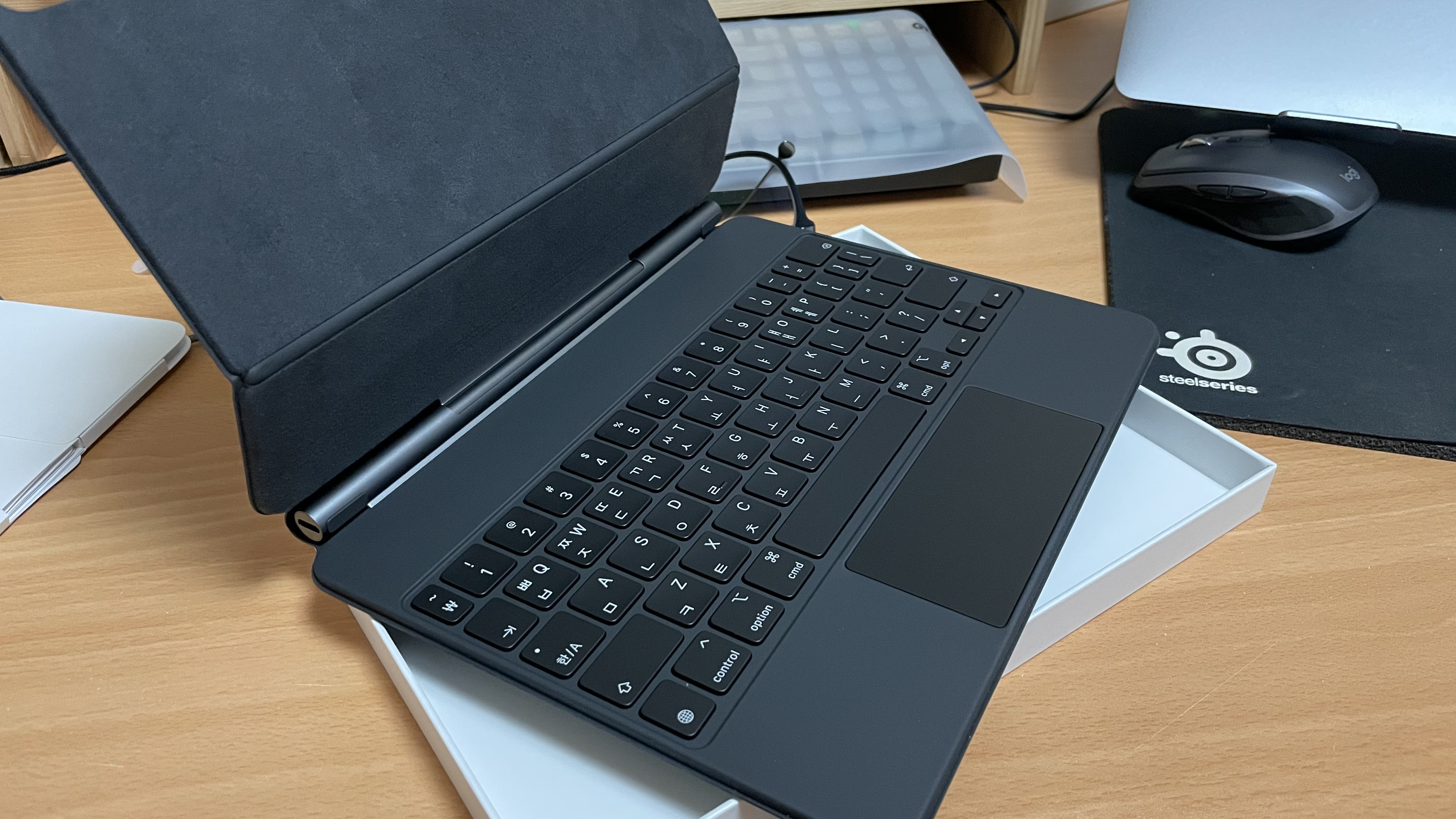 아이패드 에어 4세대와 매직 키보드 박스 개봉 전. 아이패드는 예전만큼은 아니지만 기대감이 없는 것은 아니지만, 매직 키보드는 전에 없던 제품이기에 기대감이 높은 것은 당연한 것일까? 아이패드를 매직 키보드에 장착했을 때, 마치 한 몸처럼 보여서 이질적이지 않아서 마음에 든다. 키감은 아직 익숙치 않은 점을 고려한다면 조금은 딱딱한 편이라 하겠고, 살짝 힘을 가해서 눌러줘야 하는 부분이 맥북프로의 키보드와 다르지 않았다. 그리고 키보드 하단에 위치한 터치패드는 생각보다 영역이 넓지 않아서 조작 시, 가로 방향의 끝에서 끝으로 이동 시, 손가락이 영역 밖으로 벗어나는 점이 아쉽다. 물론 적응이 아직 덜 된 탓이지만 일반적으로 사용하는 데는 맥북프로의 터치패드의 사용성과 비슷해서 크게 다르지 않았다. 익숙해져야 할 부분일 듯하다.