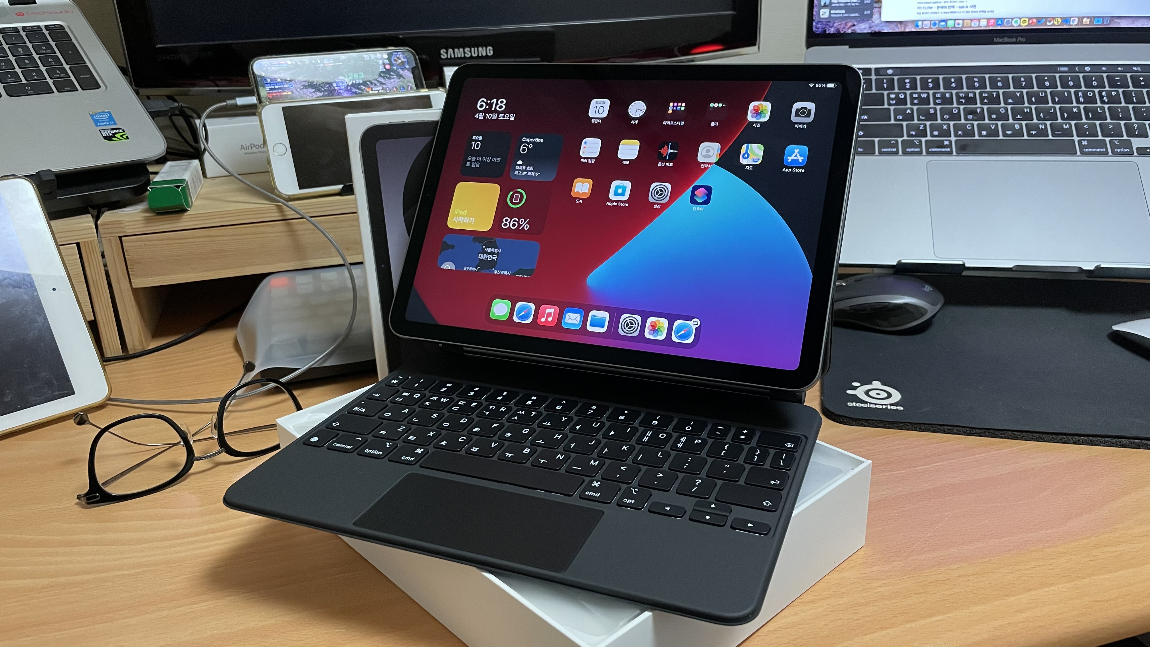 에어 4세대도 나름대로 오랫동안 사용했으면 하는 마음이다. 에어 2세대 정도의 수면을 보장받았으면 하는 바램이 있지만 어떨지는 모르겠다. 어찌 되었든, 나는 아이패드를 구입했고, 그리고 매직 키보드까지 구입을 해 버렸다. 매직 키보드는 조금 생소하게 보이기 시작했지만, 최대 약점인 무게감은 정말 엄청나다. 단점이 한 가지 더 있다. 열고 닫을 때 어떻게 해야 할지 난감했을 정도다. 자력이 강해서인지, 손톱을 상판 사이로 넣어서 약간의 힘을 줘야만 열 수 있어서 자칫 흠집이 생기지 않을까 걱정되는 정도라고 얘기하고 싶다. 무게감과 상판을 열 때를 빼면 장점이 훨씬 많은 키보드라 생각된다. 아이패드를 장착하면 연결하는 별도의 설정없이 바로 연결이 되었고, 그다음은 일반 키보드를 사용하는 방식과 크게 다르지 않았지만, 아이패드에 커서가 생긴다는 것, 그리고 패드를 사용할 수 있다는 점이 일반 맥북처럼 사용하는 재미를 느낄 수 있었고, 그로 인해 사용성이 극대화한다는 점이 장점으로 느껴졌다. 확실히 단점보다 장점이 많은 키보드임에는 틀림없는 사실일 듯하다.