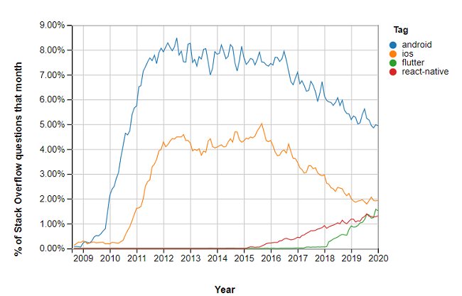 이로 인해 인공 지능 및 증강(또는 가상) 현실과 같은 알려진 기술이 만연하게 되었습니다. 결과적으로 우리는 탁월한 품질과 경험을 제공하는 보다 안정적인 앱을 갖게 되었습니다. 스택 오버플로에 대한 정보를 검색하는 사람들의 수가 증가하고 스레드의 거의 10%가 모바일에 관한 것입니다.