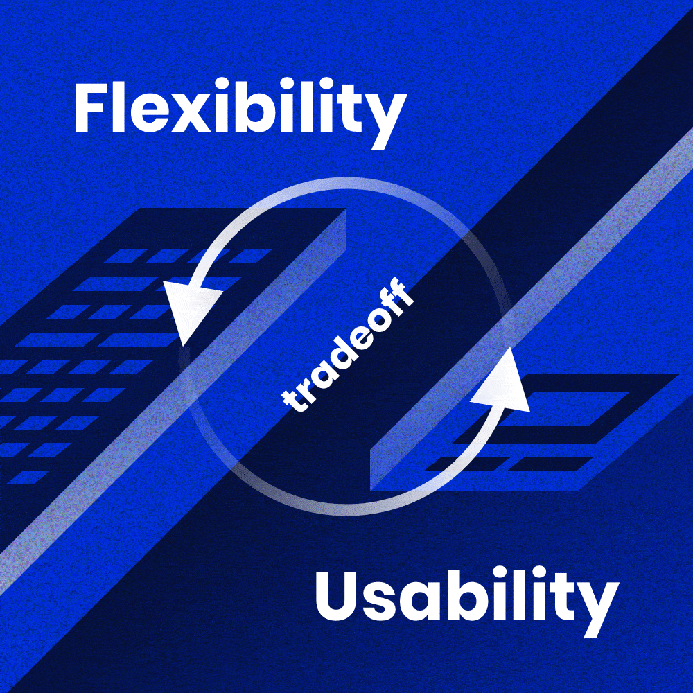 시스템의 유연성이 증가함에 따라 사용성은 감소합니다. 유연한 설계는 더 많은 기능을 지원하고 광범위한 요구 사항을 충족하지만 전문 도구보다 이러한 기능을 덜 효율적으로 수행합니다. 유연성과 유용성의 균형을 맞출 때 사용자의 요구 사항을 얼마나 잘 이해하고 있으며 사용자가 발전하거나 변경될 가능성을 고려하십시오. 유연한 제품은 복잡성, 유용성, 채택 시간 및 투자 요구 사항 측면에서 상당한 비용이 듭니다.