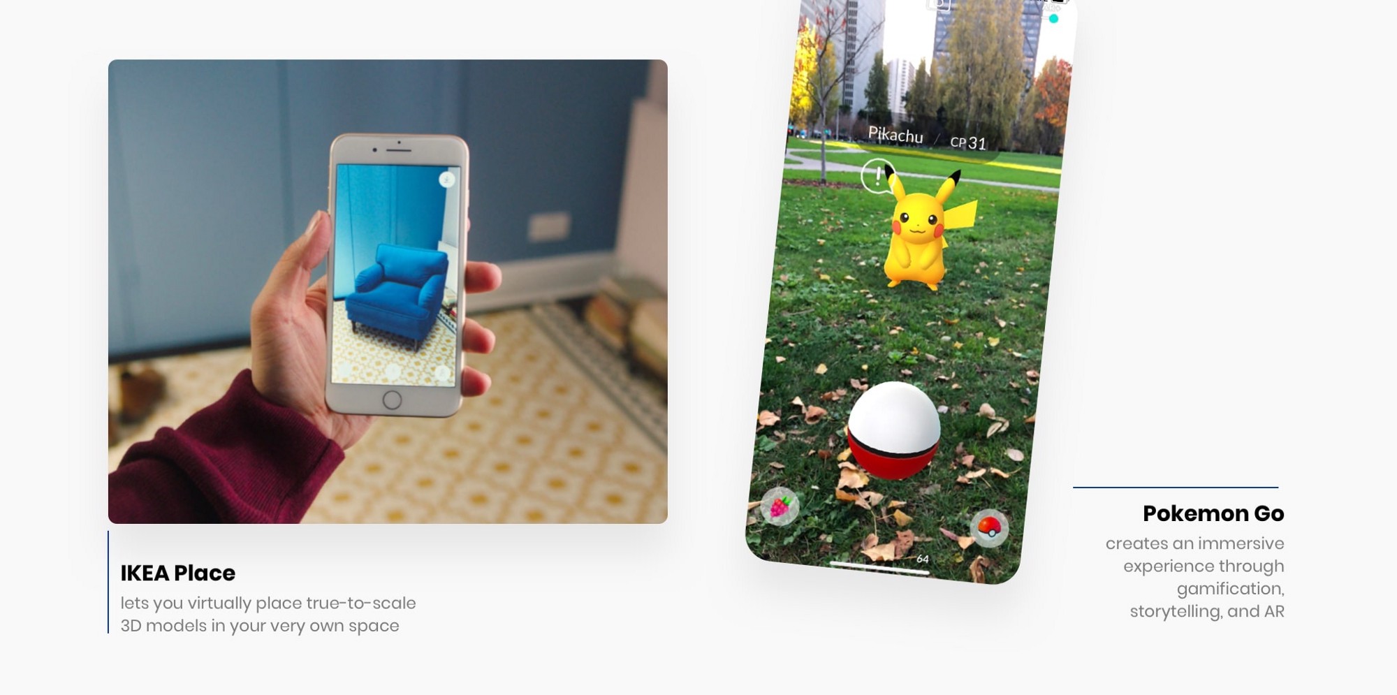 2019년에 전 세계를 강타한 앱인 Pokemon Go는 게임화, 스토리텔링, AR을 통해 몰입형 경험을 만드는 가장 좋은 예 중 하나였습니다. 200일 이내에 플레이어는 게임 내 업그레이드에 기록적인 10억 달러를 지출했습니다. IKEA Place를 사용하면 실제 크기의 3D 모델을 나만의 공간에 가상으로 배치할 수 있습니다. 최신 AR 기술과 IKEA의 스마트 홈 솔루션을 결합하여 이전과는 다른 IKEA를 경험할 수 있습니다.