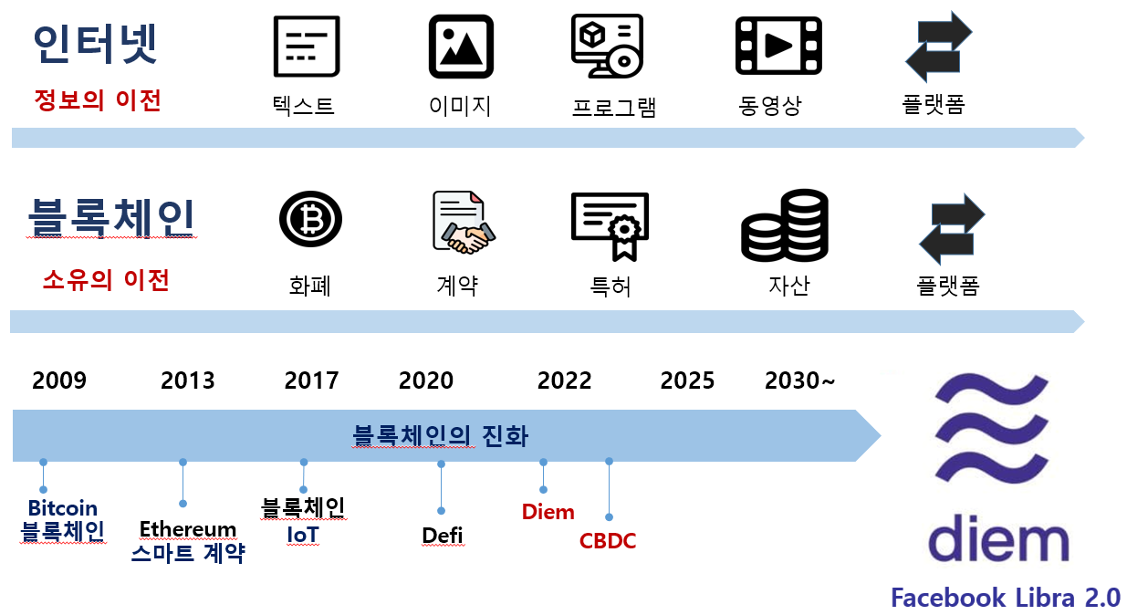 [그림 2] 블록체인 기술의 진화. 블록체인은 인터넷 처럼 인프라 기술로 활용되며 사물인터넷, 디파이, 디엠, CDBC 등으로 진화하고 있다.